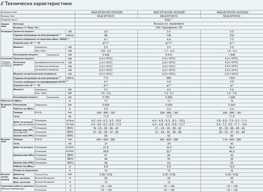 | Шумови нива при охлаждане, dB(A) | 30 / 33 / 36 / 40 / 43 |