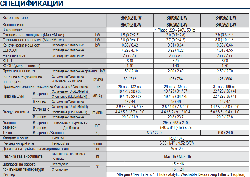 | Размер на тръбите (течност/газ) | 6.35 (1/4″) / 9.52 (3/8″) |